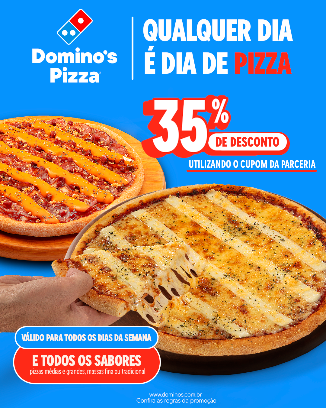 Regras: Válidas apenas para pedidos no site ou App da Domino’s Pizza; válido para pizzas médias e grandes; massas fina ou tradicional, todos os sabores; válido todos os dias da semana; o desconto é aplicado apenas na pizza, não no pedido completo; não se aplica à taxa de entrega; não cumulativo com outras promoções; também válido para carryout (retirada na loja); o cupom deve ser inserido no carrinho no momento do checkout; não é válido para pedidos feitos no balcão.